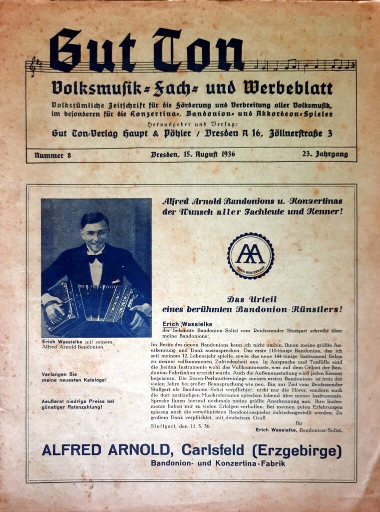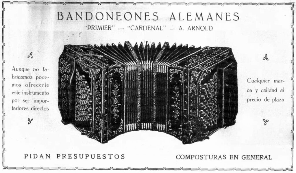 Doch den Höhepunkt der Exporterfolge nach Lateinamerika erreichen die „Arnoldschen“ Instrumente aus Carlsfed/Sa. zwischen 1910 bis 1939. Dort avancierte es zum <Bandoneón>, gab dem Tango seine Stimme und sicherte sich so sein „Überleben“.