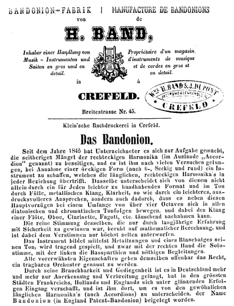 Genannter Krefelder Instrumenten- & Musikalienhändler Band, setzte um 1857 auf die von ihm gehandelten ‚Concertinas resp. Accordions‘ die Eigenmarke ‚Bandonion‘ (Branding), welche als Balgklappenschild vom Hersteller anzubringen war. Die in Sachsen gefertigten Instrumente wurden mit „Heinrich Band“ (später Alfred Band) etikettiert und zudem als Eigenfabrikation mit „Bandonionfabrik Crefeld“ beworben.