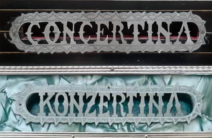 Wann sich die englische Schreibweise „Concertina“ in „Konzertina“ eindeutschte ist nicht ganz klar. Beide Schreibweisen sind bis ins 20. Jahrhundert anzutreffen. Auf Balgklappenschildern ist die deutsche Schreibweise äußerst selten.