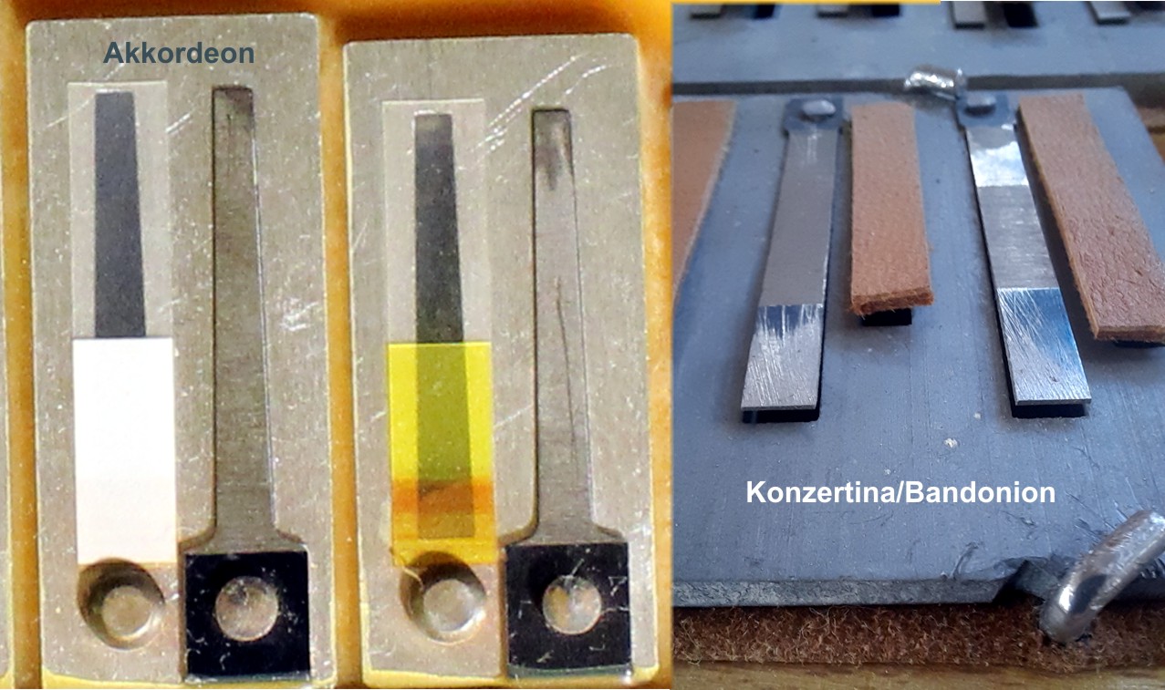 Anmerkung: Der elementarste „klangliche Unterschied“ zwischen Akkordeon und Konzertina/Bandonion ergibt sich aus der Stimmzungenbauform. Im Akkordeon sind vorwiegend „konische“ Stimmzungen auf Einzelplatte enthalten, in den Einzeltoninstrumenten „zylindrische“ auf Sammelplatte. In der Nachkriegsproduktion von [Arno Arnold] im Hessischen Obertshausen, wurde dieses Wesensmerkmal im Bandonionbau aufgegeben und massenhaft konische Zungen verbaut. Ein Grund mehr, doch gleich Akkordeon zu lernen, weshalb die dortige Produktion 1971 eingestellt wurde.